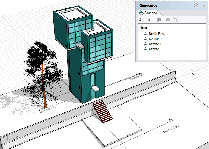 - Activate sections: See the list of section lines in the model and show the model in a real-time section activating any of them. The sectioned geometry will show the section attributes defined by the Section styles.